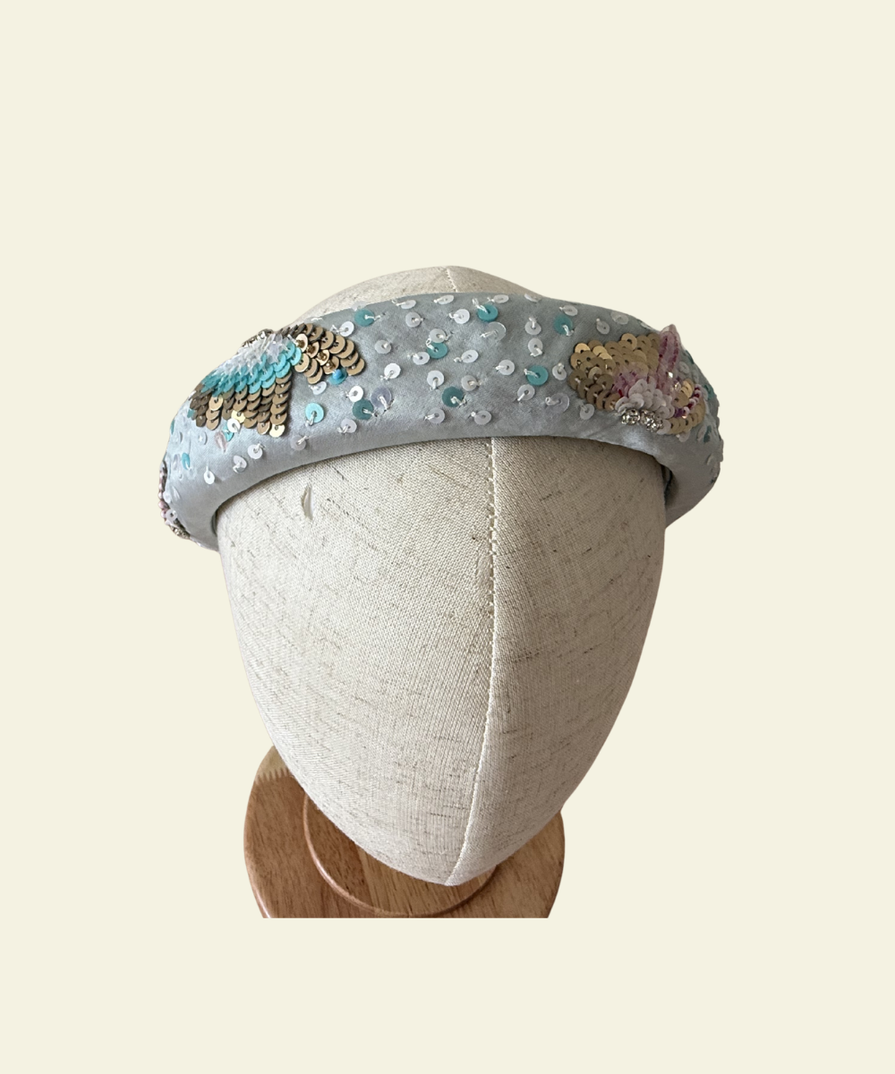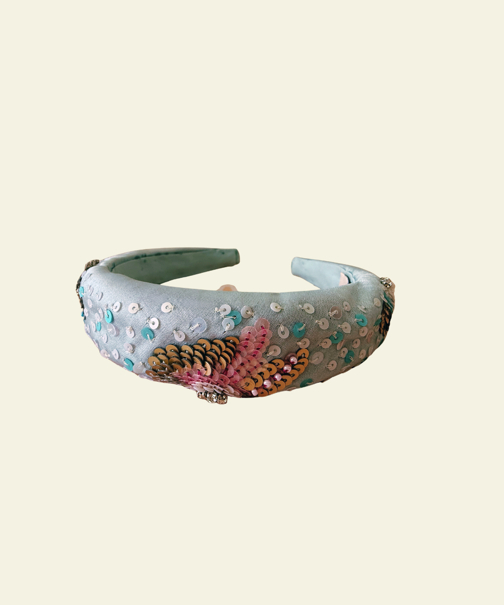 A soft statement headband adorned with shimmering aqua, pearl, and gold sequined butterfly details. Light-catching yet refined, it’s the perfect finishing touch for your lil olives dresses.